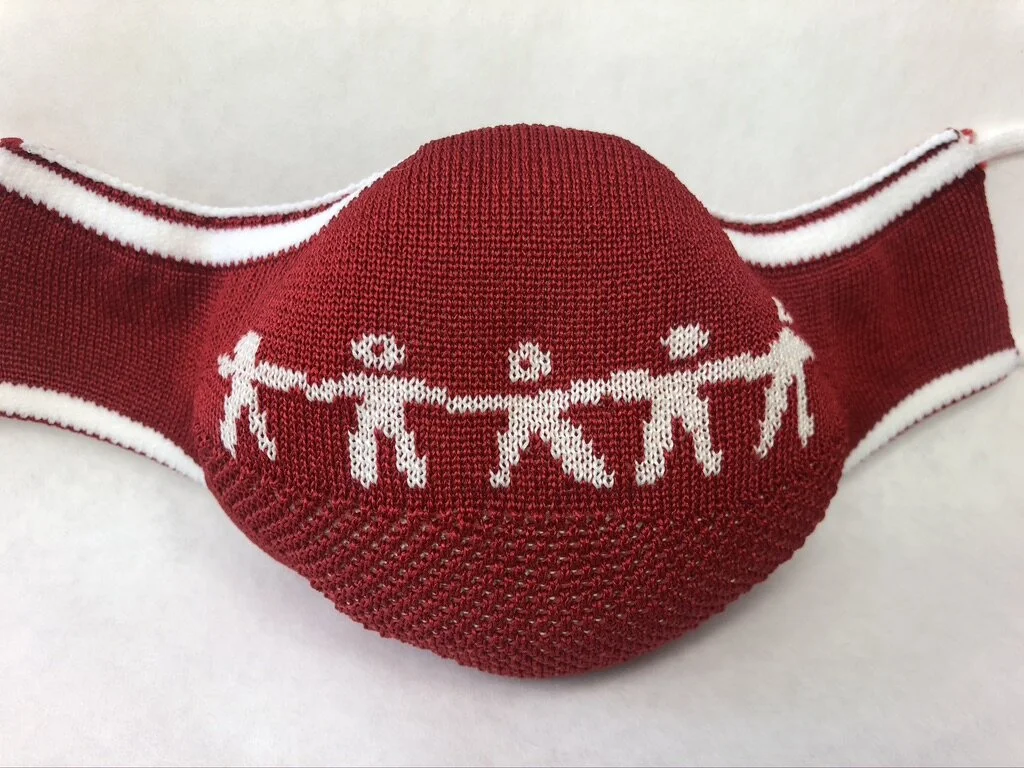 This is a first face mask featuring an "air dome" - a pocket of free space between the mask and your face that allows you to breathe in naturally but helps to prevent the spread of the bad stuff when you breath out. The mask is 3D knitted to go over the contours of your face without touching it while the elastic bands on the top and bottom give it a snug fit. A seamless construction is more durable and leaves no waste.